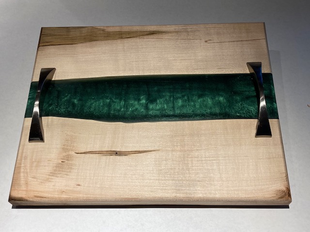 Introducing our handcrafted charcuterie board, a culinary canvas that seamlessly marries form and function, bringing artistry to your dining experience. Carefully carved from the finest hardwoods, this board is a testament to the timeless skill of our artisans. Admire the natural beauty of the wood grain, accentuated by a mesmerizing green epoxy river running gracefully down the length of the board, adding a touch of contemporary elegance to its rustic charm.
